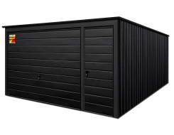 Garaż blaszany 4X4 LUX – Spad dachu do tyłu, brama uchylna, drzwi, czarny mat