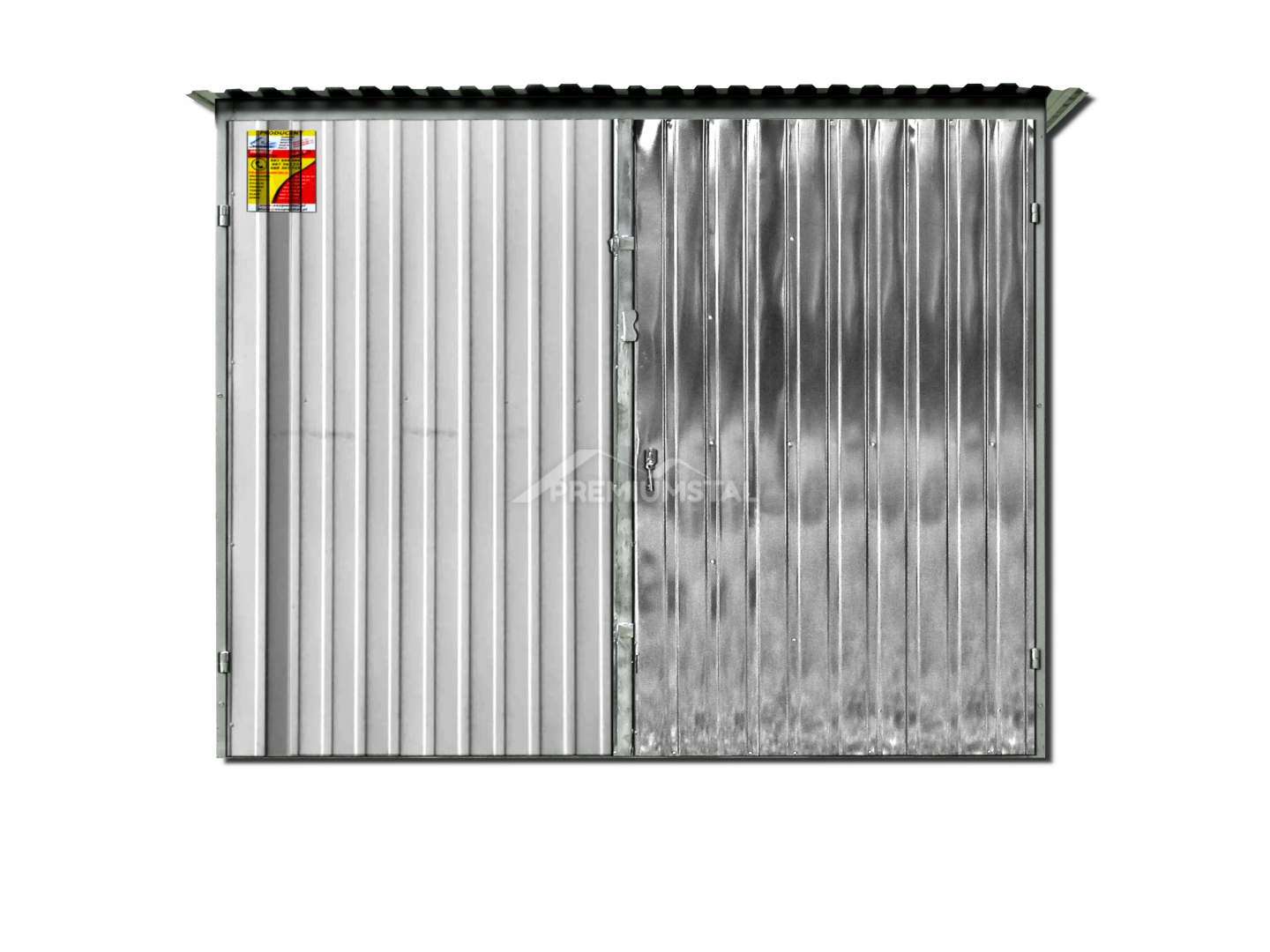 GARAŻ BLASZANY 3X5 W II GATUNKU BLACHY – SPAD DACHU DO TYŁU, BRAMA DWUSKRZYDŁOWA