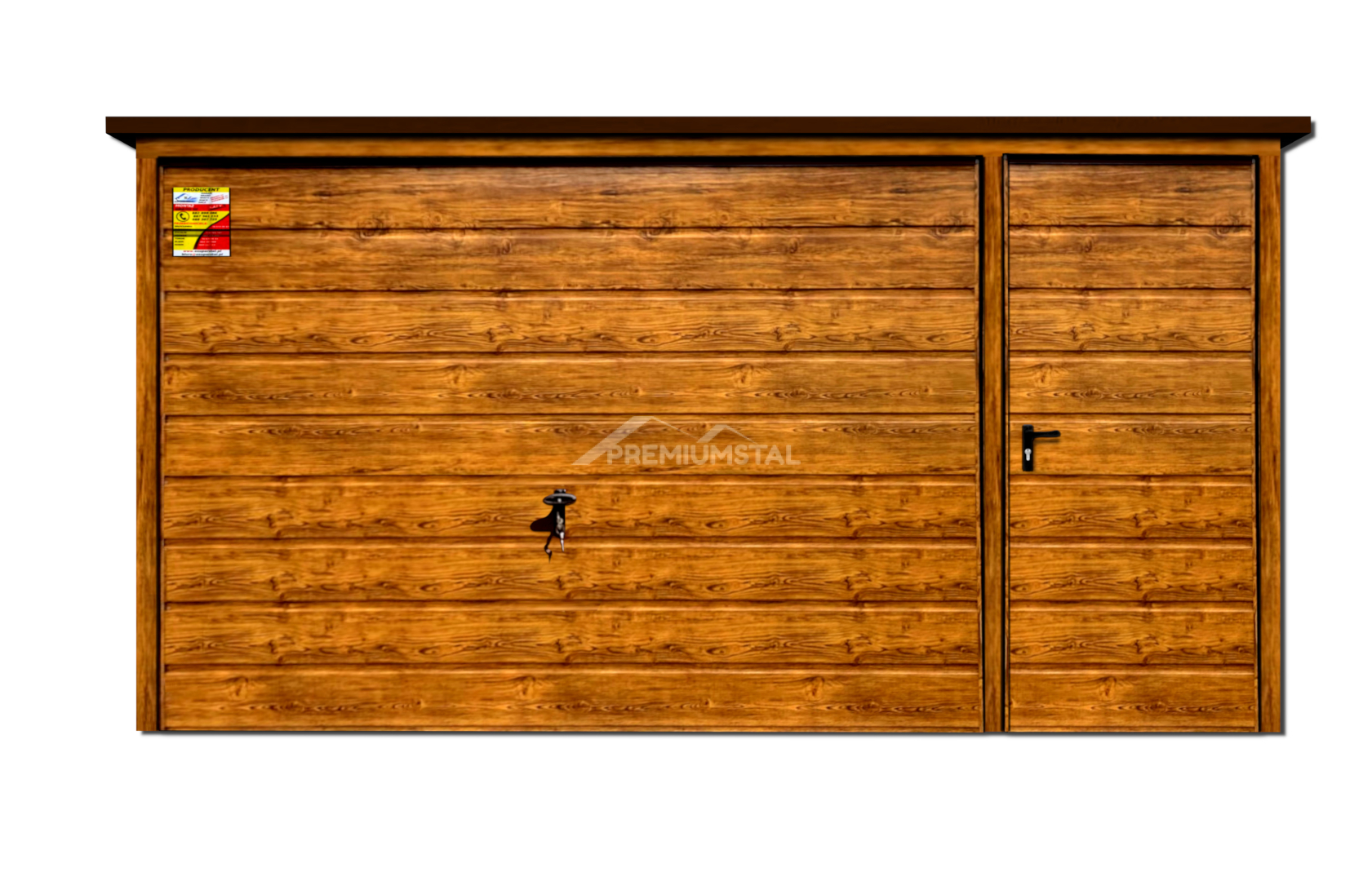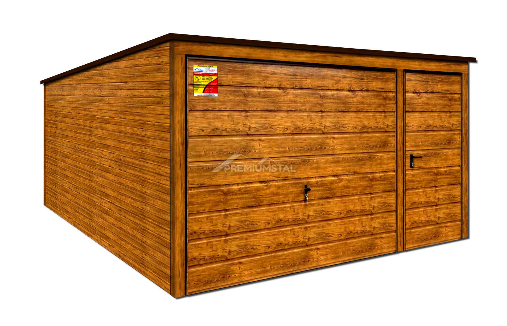 Garaż blaszany 4X6 PREMIUM – Spad dachu do tyłu, brama uchylna i drzwi Blaszak w kolorze drewnopodobnym, profil zamknięty, okucia blacharskie
