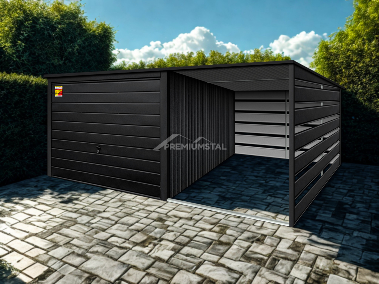 GARAŻ LUX 4X5 Z WIATĄ SMK – SPAD DACHU DO TYŁU, BRAMA UCHYLNA, OKUCIA BLACHARSKIE DACHU I NAROŻNIKÓW