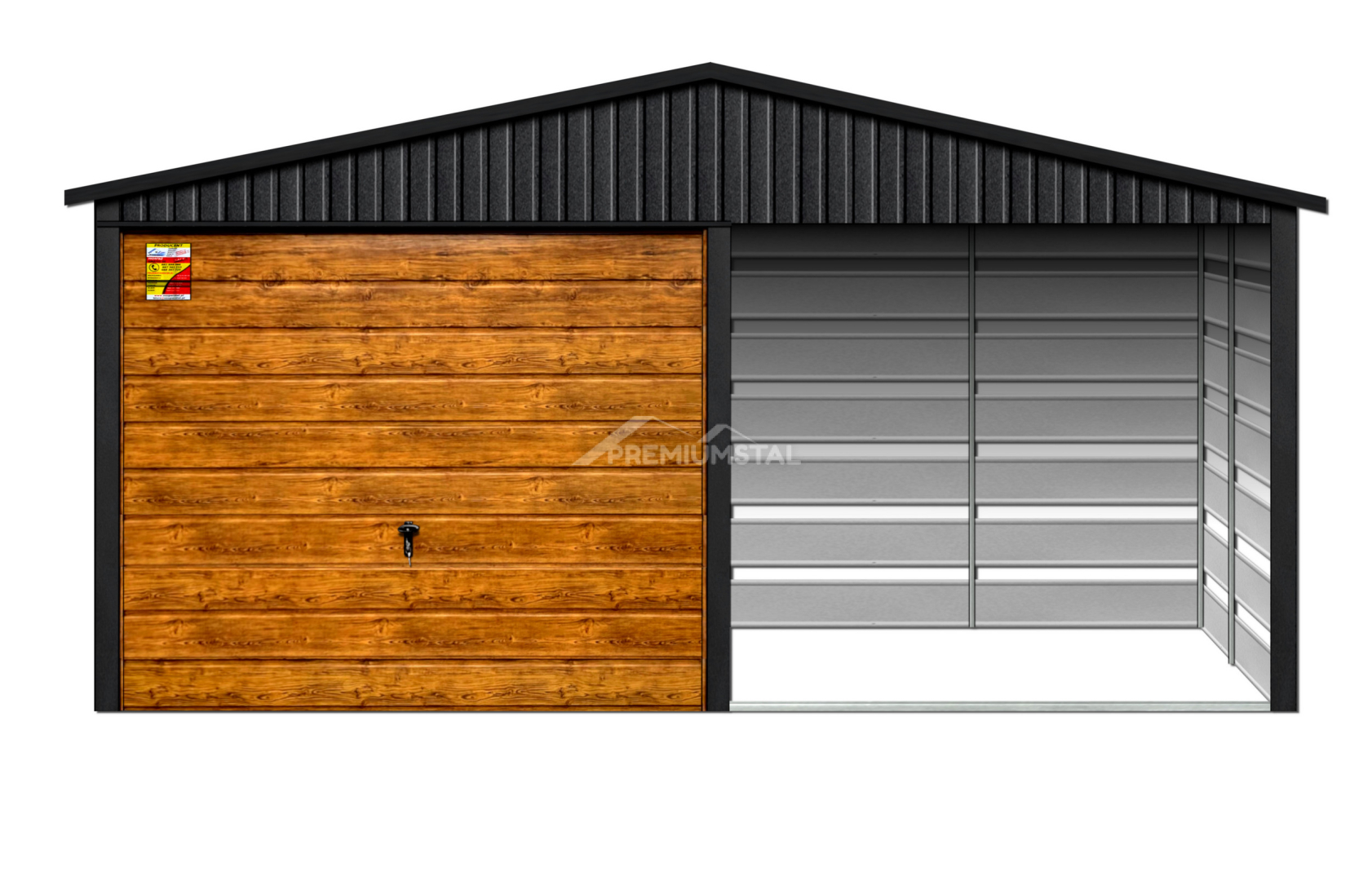 GARAŻ LUX 4X7 Z WIATĄ SMK – DWUSPADOWY DACH, BRAMA UCHYLNA SOSNA, OKUCIA BLACHARSKIE DACHU I NAROŻNIKÓW