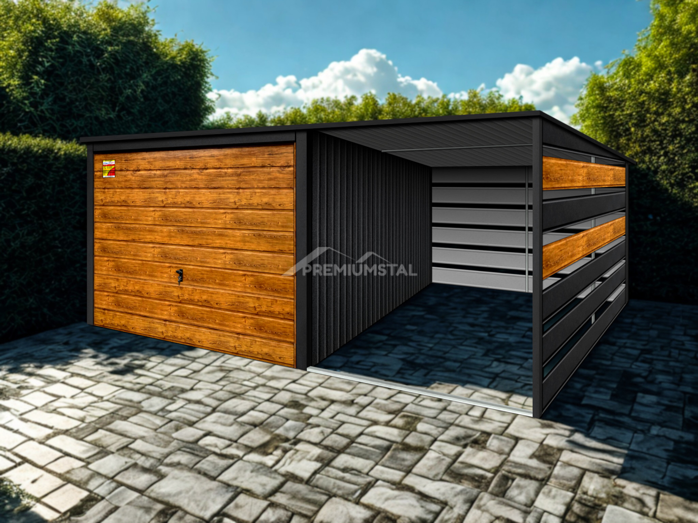 GARAŻ LUX 4X7 Z WIATĄ SMK – SPAD DACHU DO TYŁU, BRAMA UCHYLNA SOSNA, OKUCIA BLACHARSKIE DACHU I NAROŻNIKÓW