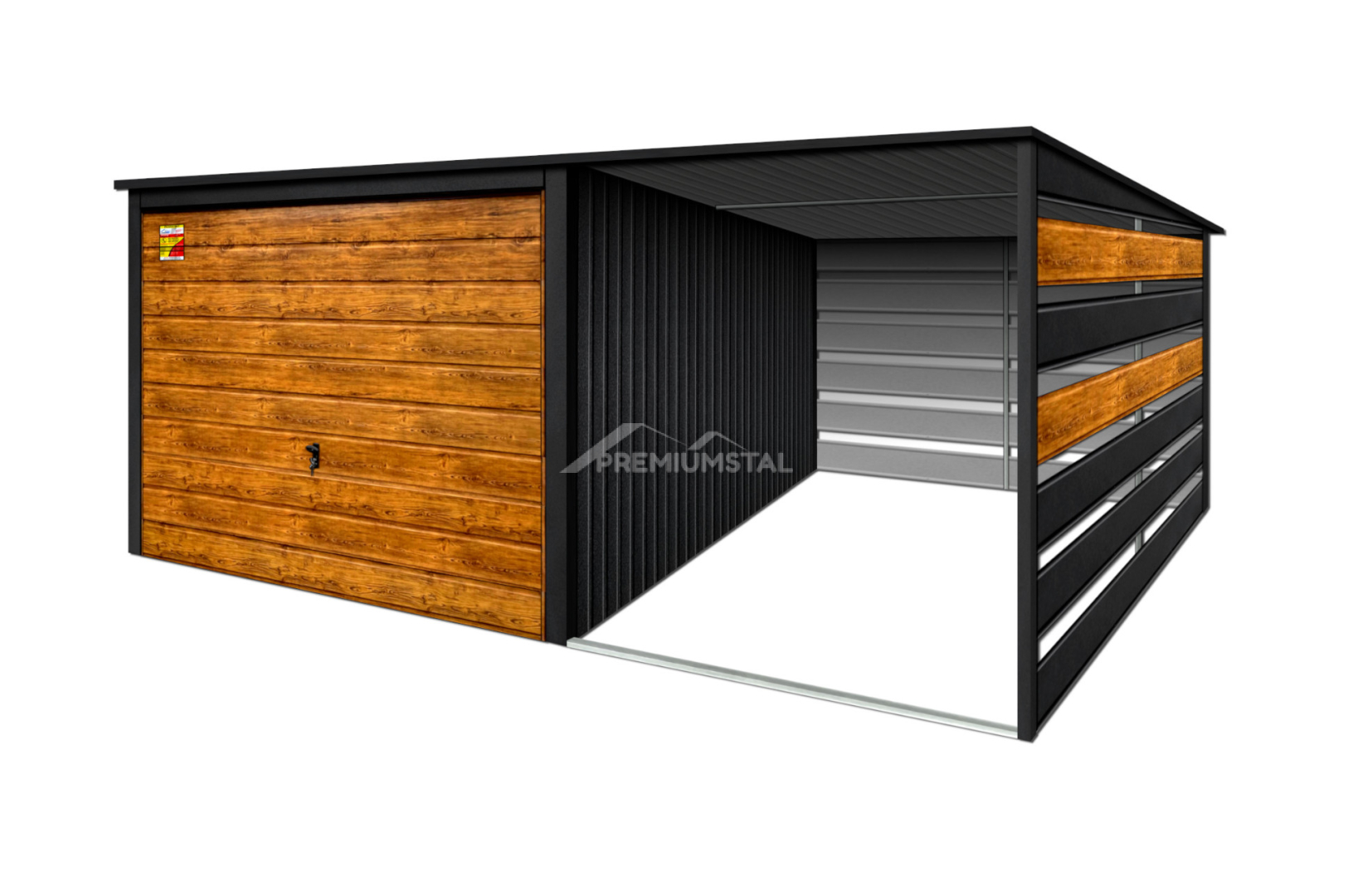 GARAŻ LUX 4X8 Z WIATĄ SMK – SPAD DACHU DO TYŁU, BRAMA UCHYLNA SOSNA, OKUCIA BLACHARSKIE DACHU I NAROŻNIKÓW