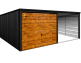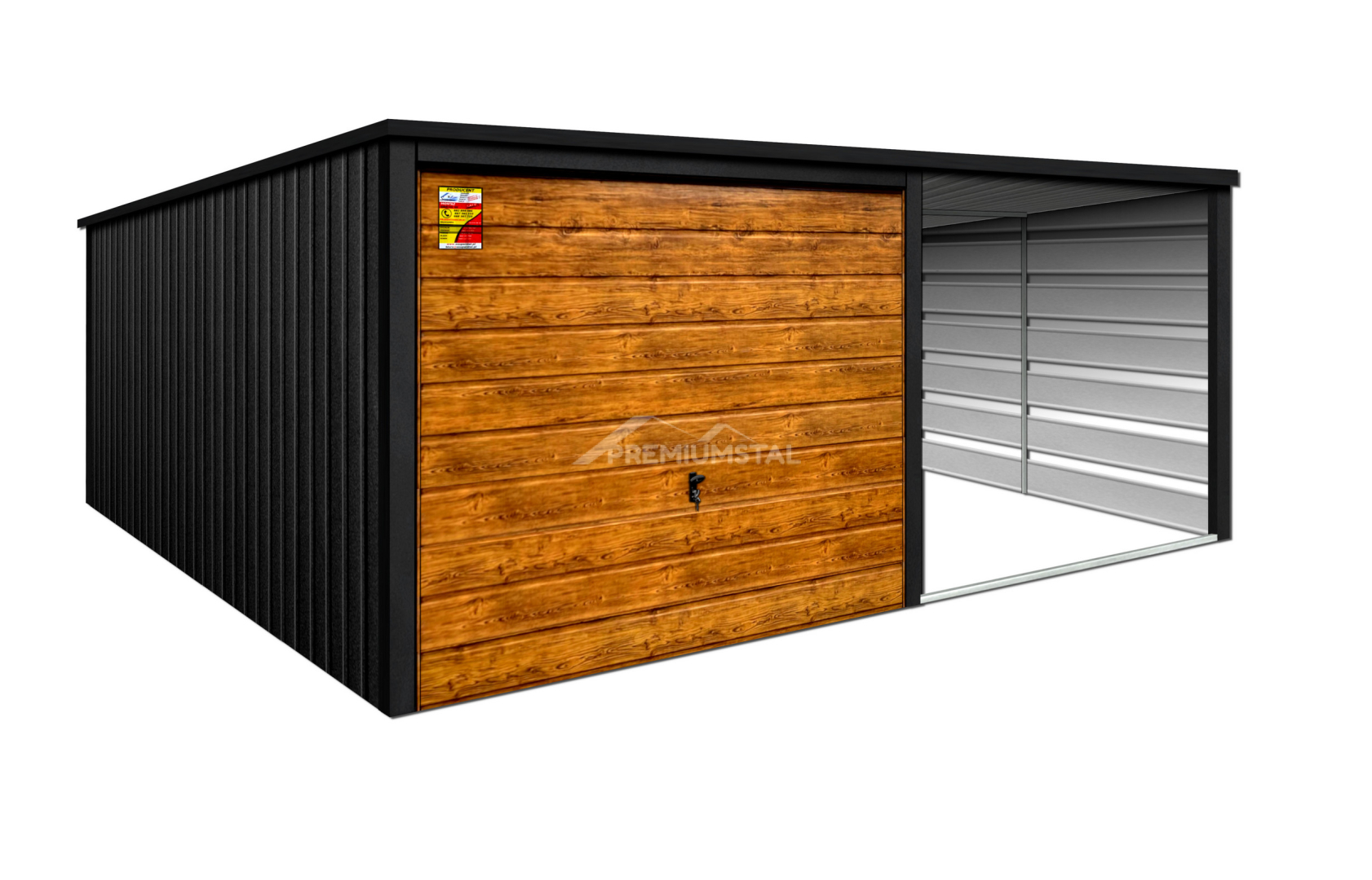 GARAŻ LUX 5X6 Z WIATĄ SMK – SPAD DACHU DO TYŁU, BRAMA UCHYLNA SOSNA, OKUCIA BLACHARSKIE DACHU I NAROŻNIKÓW