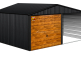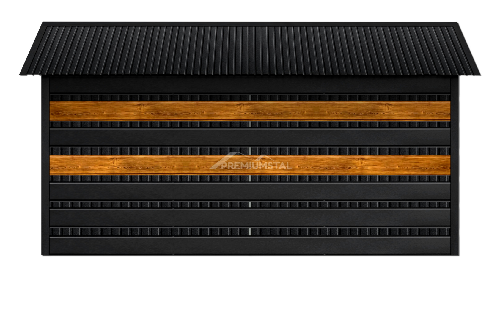 GARAŻ LUX 5X9 Z WIATĄ SMK – DWUSPADOWY DACH, BRAMA UCHYLNA SOSNA, OKUCIA BLACHARSKIE DACHU I NAROŻNIKÓW