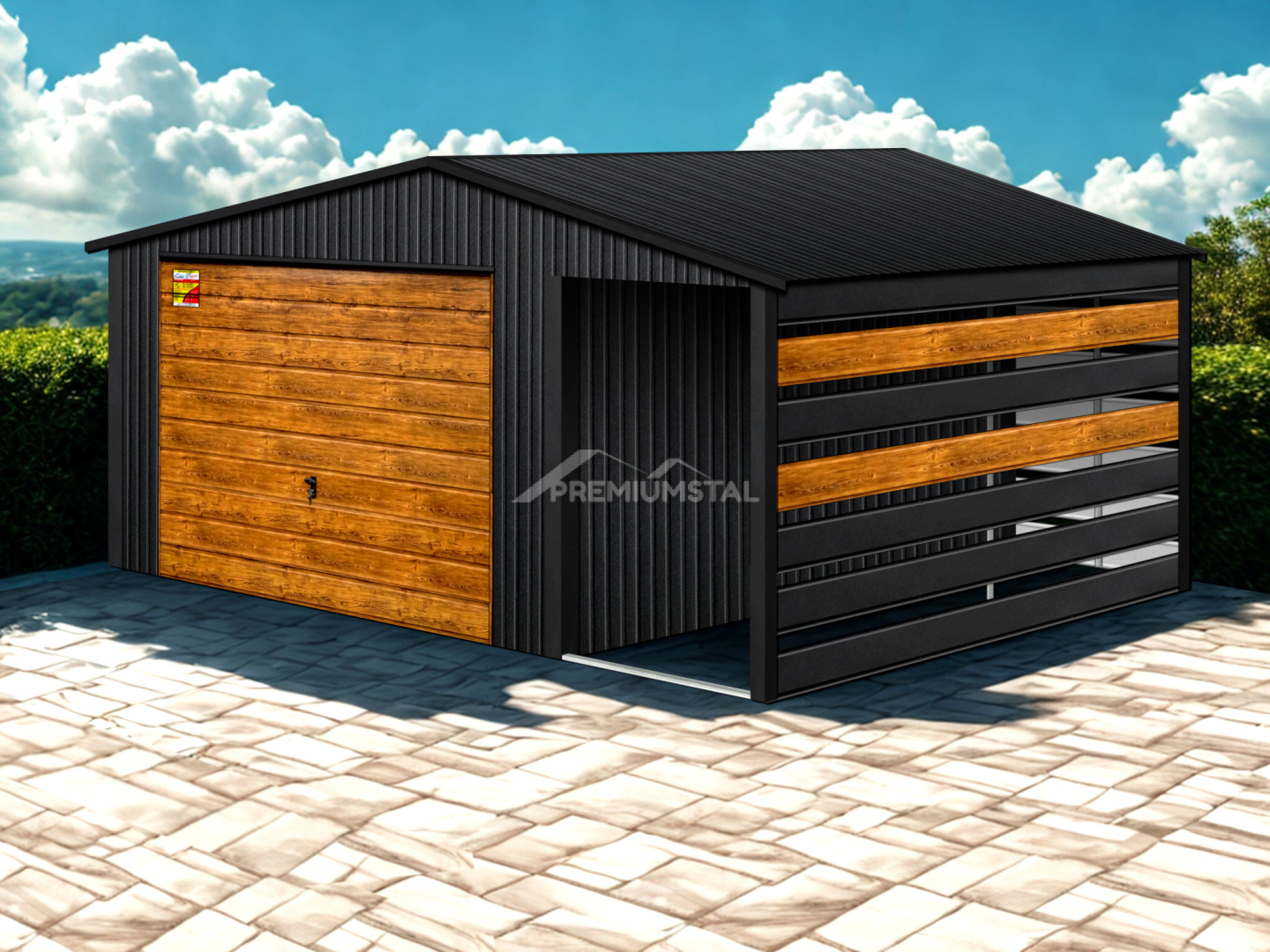 GARAŻ LUX 6X7 Z WIATĄ SMK – DWUSPADOWY DACH, BRAMA UCHYLNA SOSNA, OKUCIA BLACHARSKIE DACHU I NAROŻNIKÓW