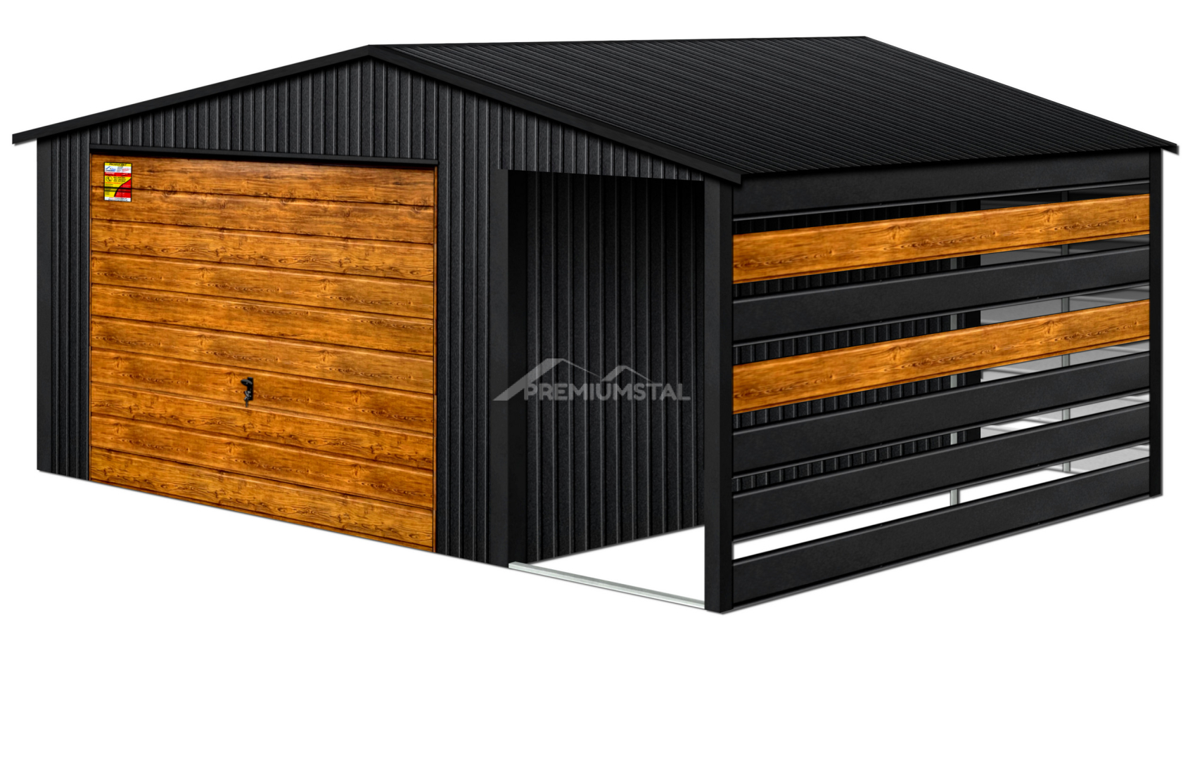 GARAŻ LUX 7X9 Z WIATĄ SMK – DWUSPADOWY DACH, BRAMA UCHYLNA SOSNA, OKUCIA BLACHARSKIE DACHU I NAROŻNIKÓW