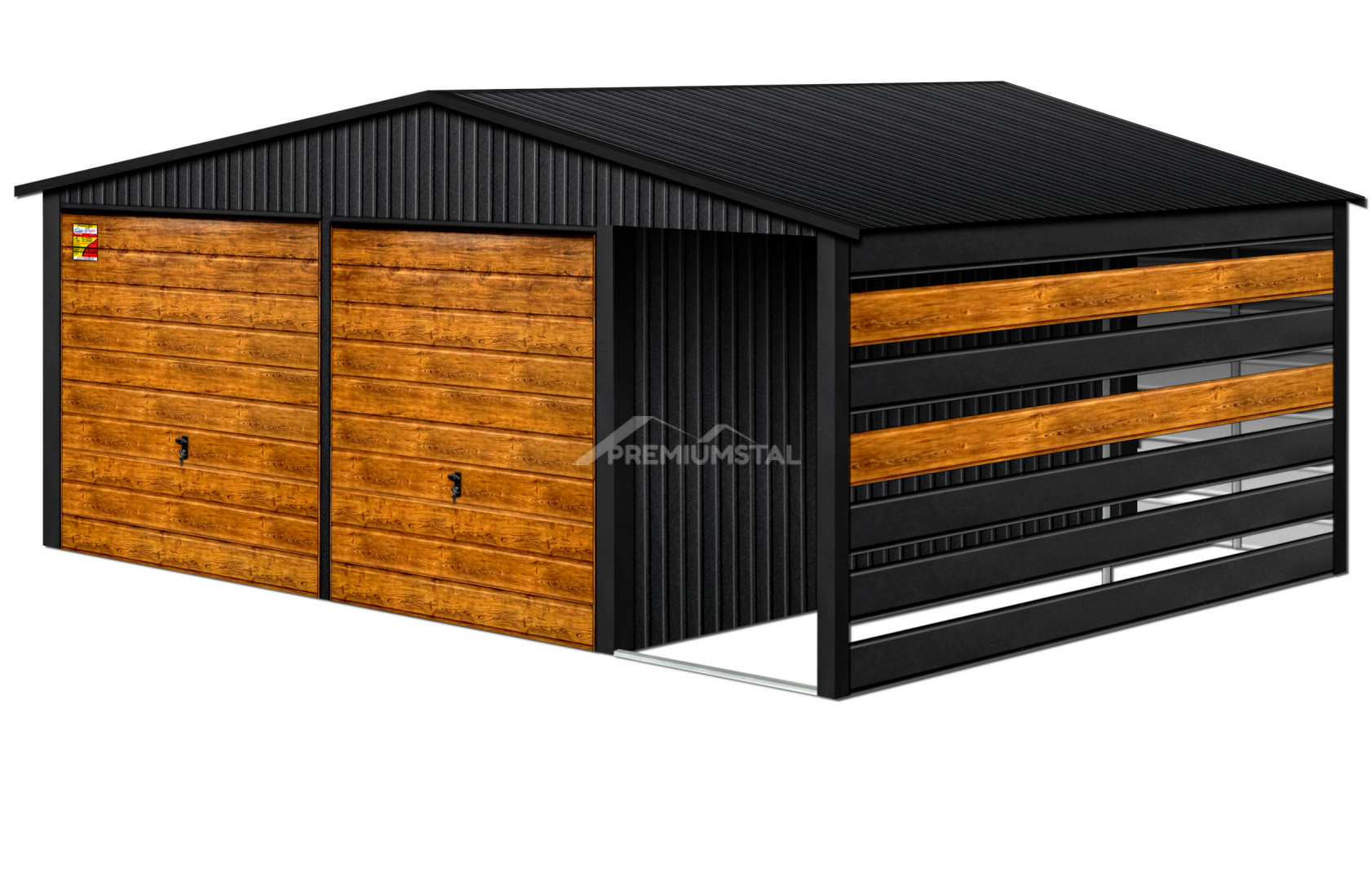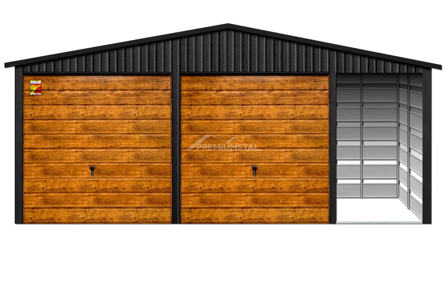 GARAŻ LUX 8X5 Z WIATĄ SMK – DWUSPADOWY DACH, BRAMY UCHYLNE SOSNA, OKUCIA BLACHARSKIE DACHU I NAROŻNIKÓW