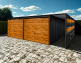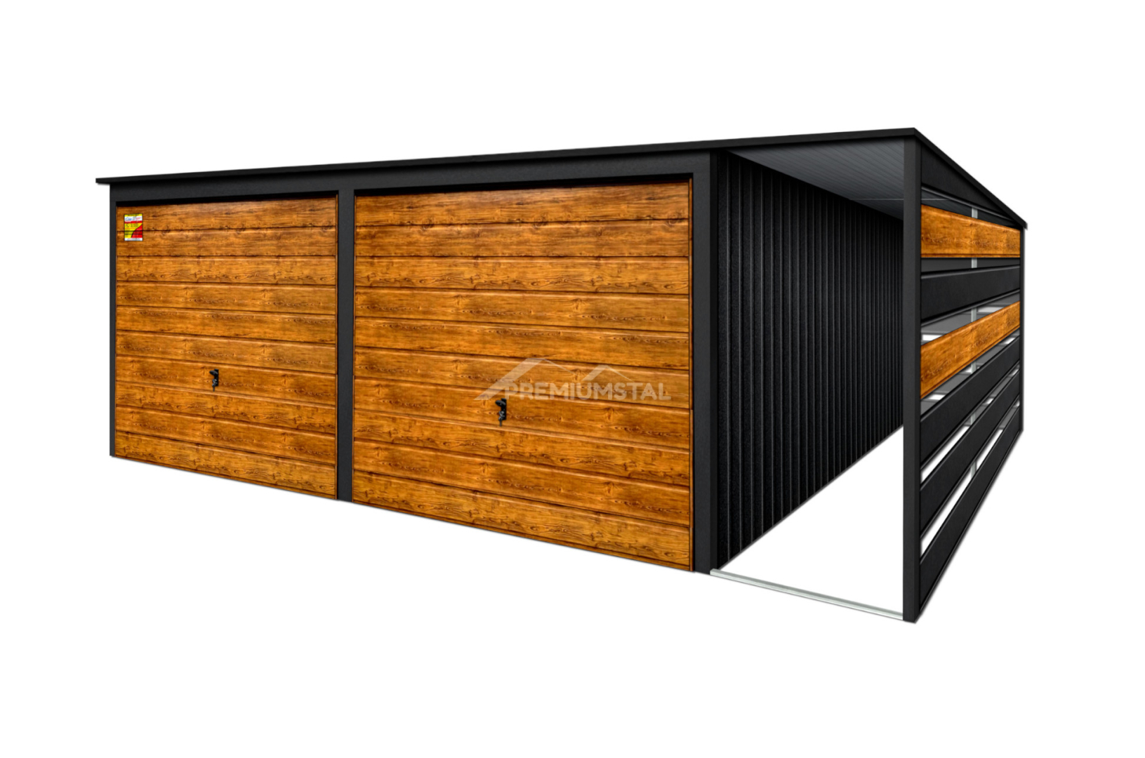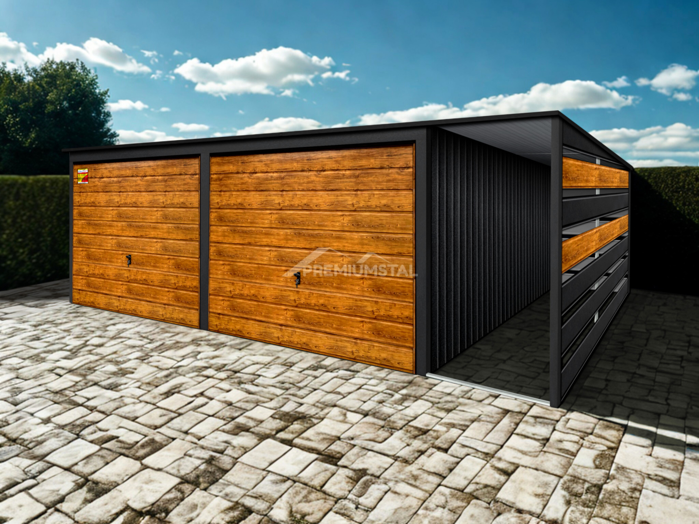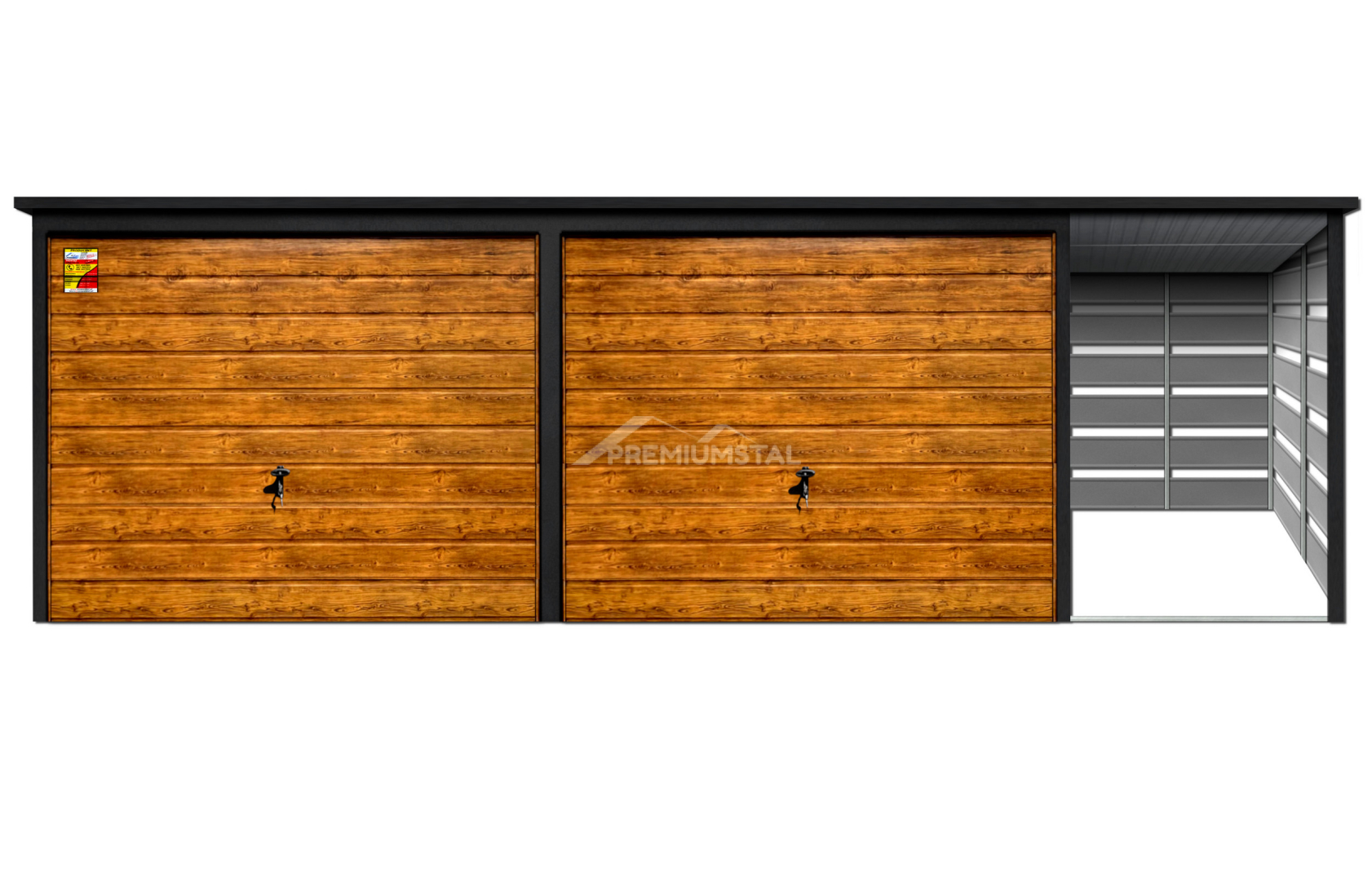 GARAŻ LUX 8X6 Z WIATĄ SMK – SPAD DACHU DO TYŁU, BRAMY UCHYLNE SOSNA, OKUCIA BLACHARSKIE DACHU I NAROŻNIKÓW
