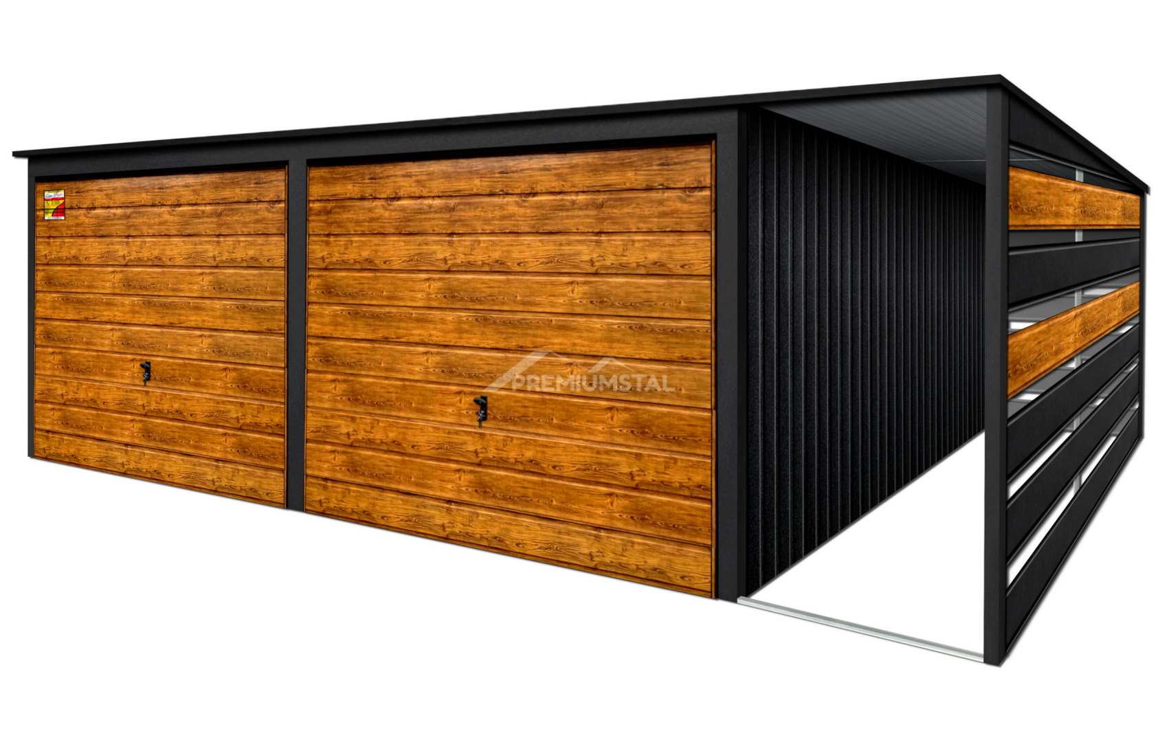 GARAŻ LUX 8X7 Z WIATĄ SMK – SPAD DACHU DO TYŁU, BRAMY UCHYLNE SOSNA, OKUCIA BLACHARSKIE DACHU I NAROŻNIKÓW