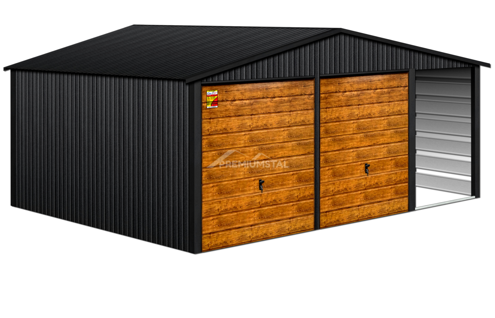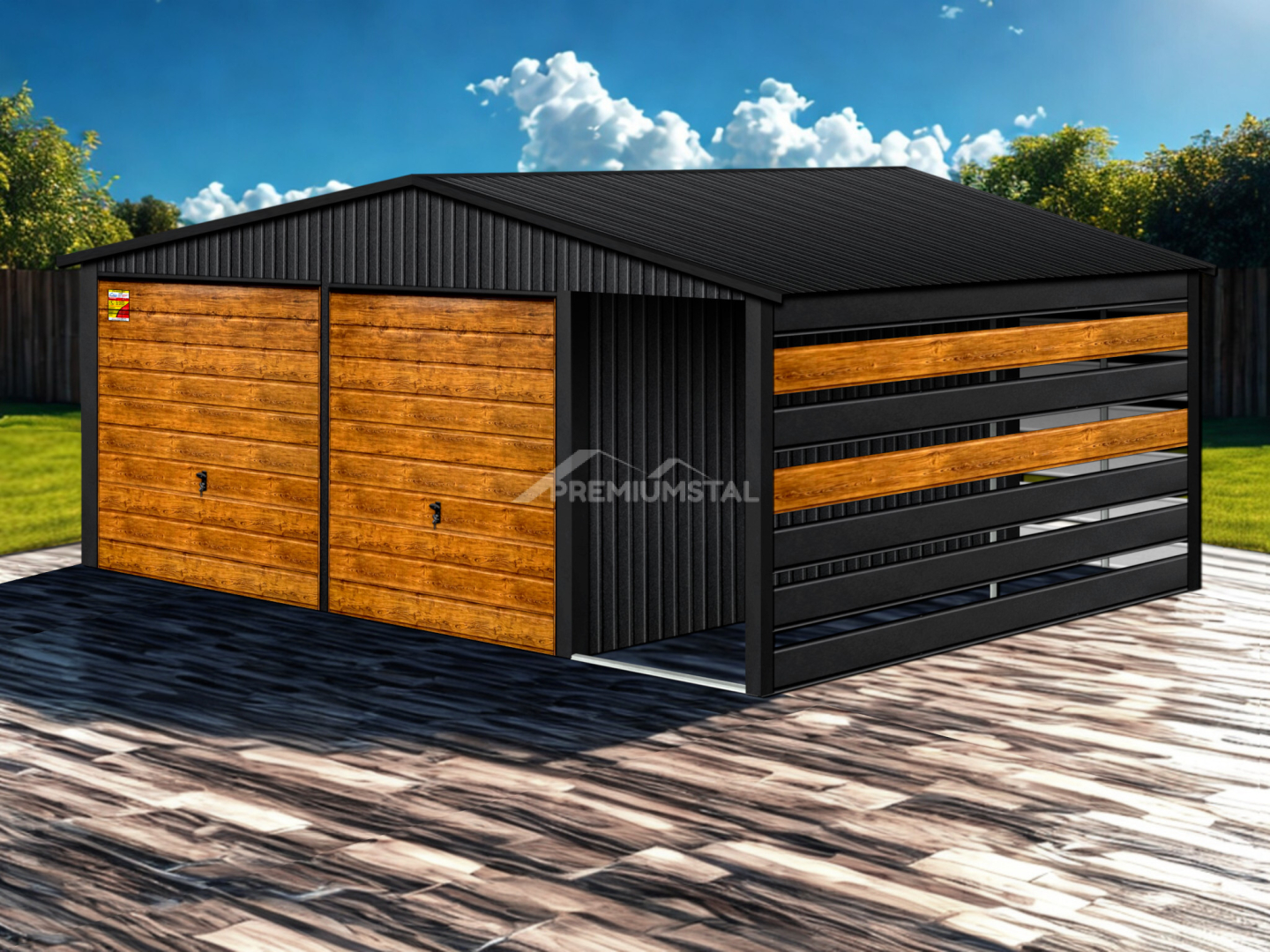 GARAŻ LUX 8X9 Z WIATĄ SMK – DWUSPADOWY DACH, BRAMY UCHYLNE SOSNA, OKUCIA BLACHARSKIE DACHU I NAROŻNIKÓW