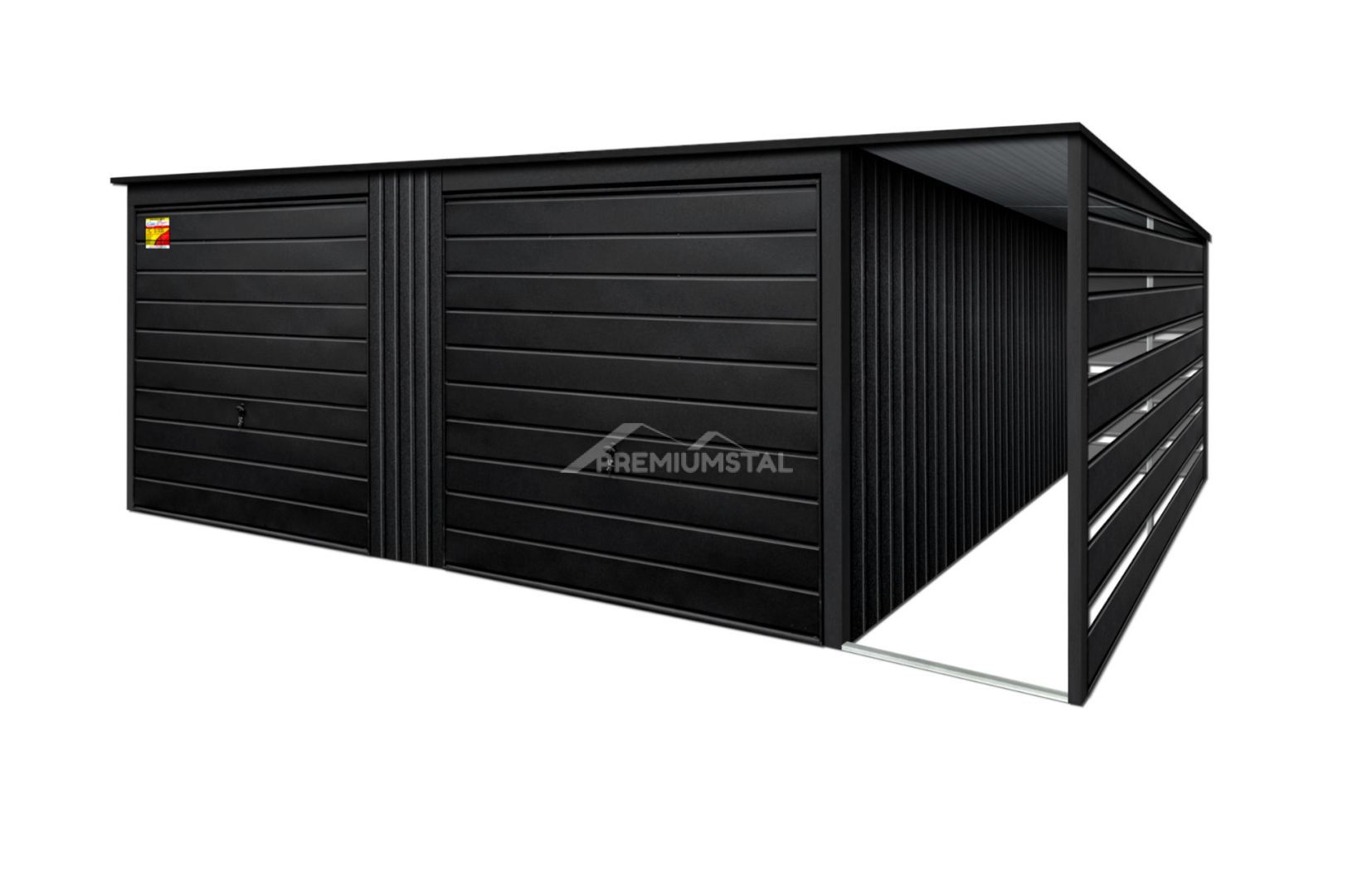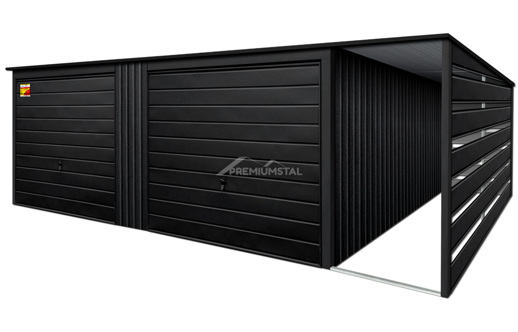 GARAŻ LUX 9X5 Z WIATĄ SMK – SPAD DACHU DO TYŁU, DWIE BRAMY UCHYLNE, OKUCIA BLACHARSKIE DACHU I NAROŻNIKÓW
