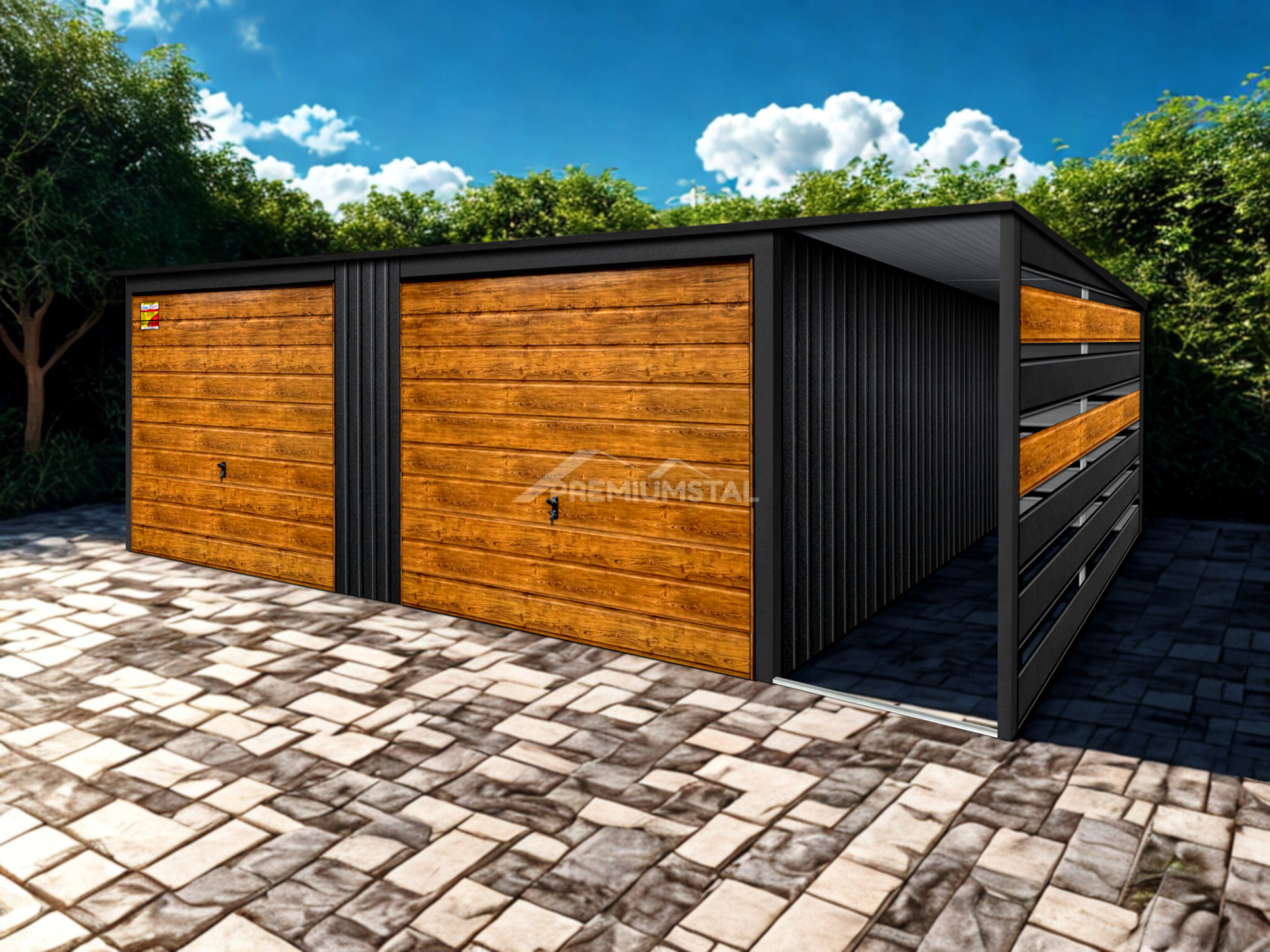 GARAŻ LUX 9X7 Z WIATĄ SMK – SPAD DACHU DO TYŁU, BRAMY UCHYLNE SOSNA, OKUCIA BLACHARSKIE DACHU I NAROŻNIKÓW