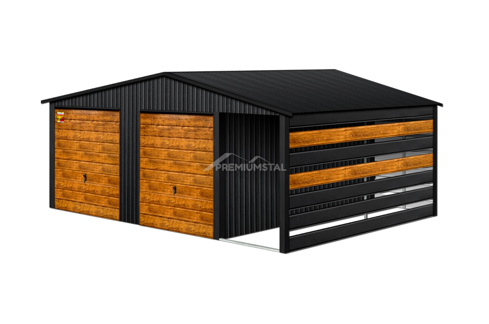 GARAŻ LUX 9X9 Z WIATĄ SMK – DWUSPADOWY DACH, BRAMY UCHYLNE SOSNA, OKUCIA BLACHARSKIE DACHU I NAROŻNIKÓW