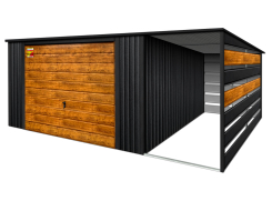 Garaż LUX 8X4 z wiatą SMK – Spad dachu do tyłu, bramy uchylne SOSNA