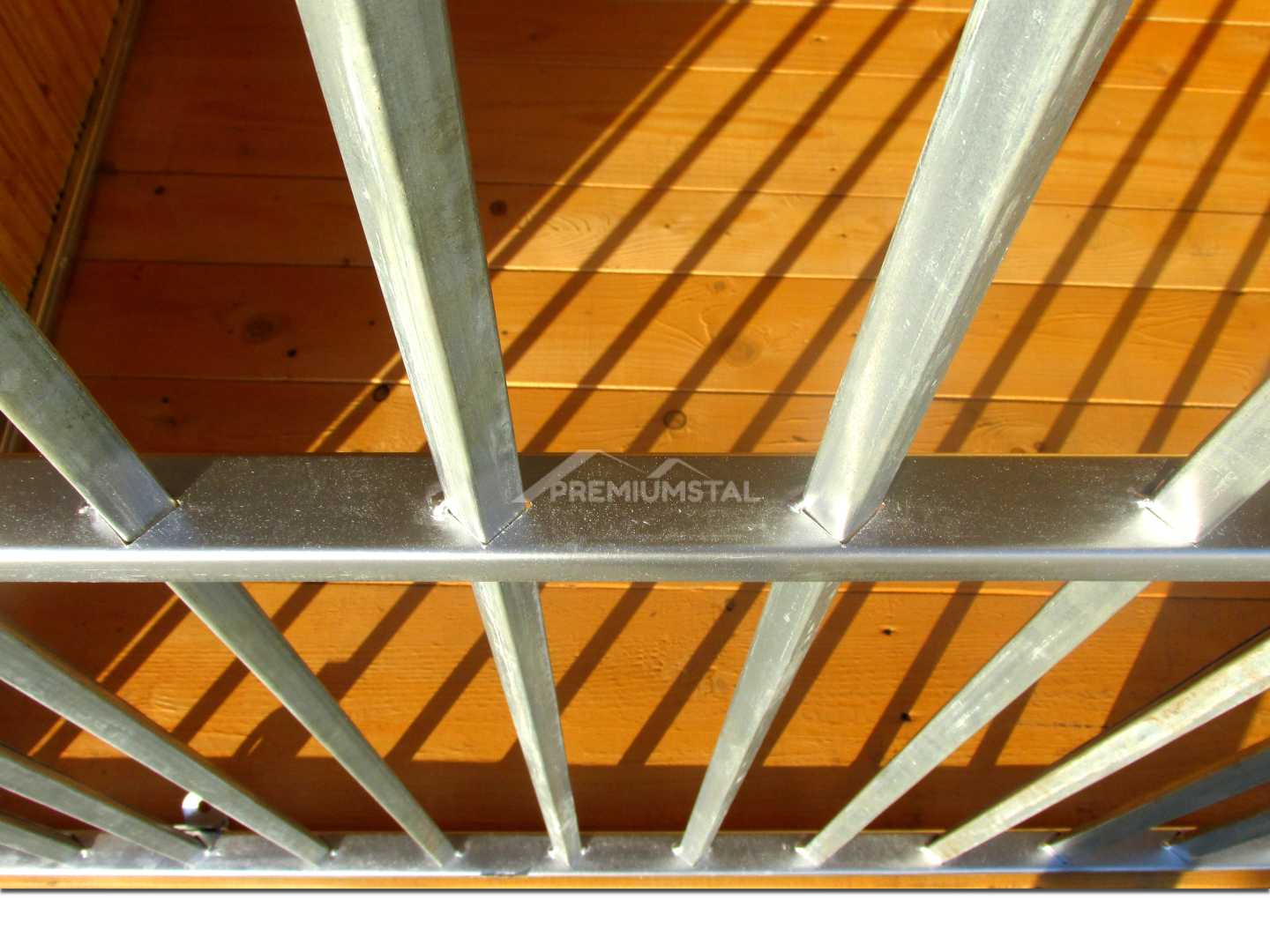 Konstrukcja z profilu ocynkowanego – kojec wykonany z kwadratowych profili ocynkowanych, zawijanych-niezgrzewanych o wymiarze 20x20 mm. Dodatkowo kojec posiada wzmocnienie poziome z ceownika ocynkowanego. Odstępy między profilami wynoszą około 8,5 cm.