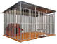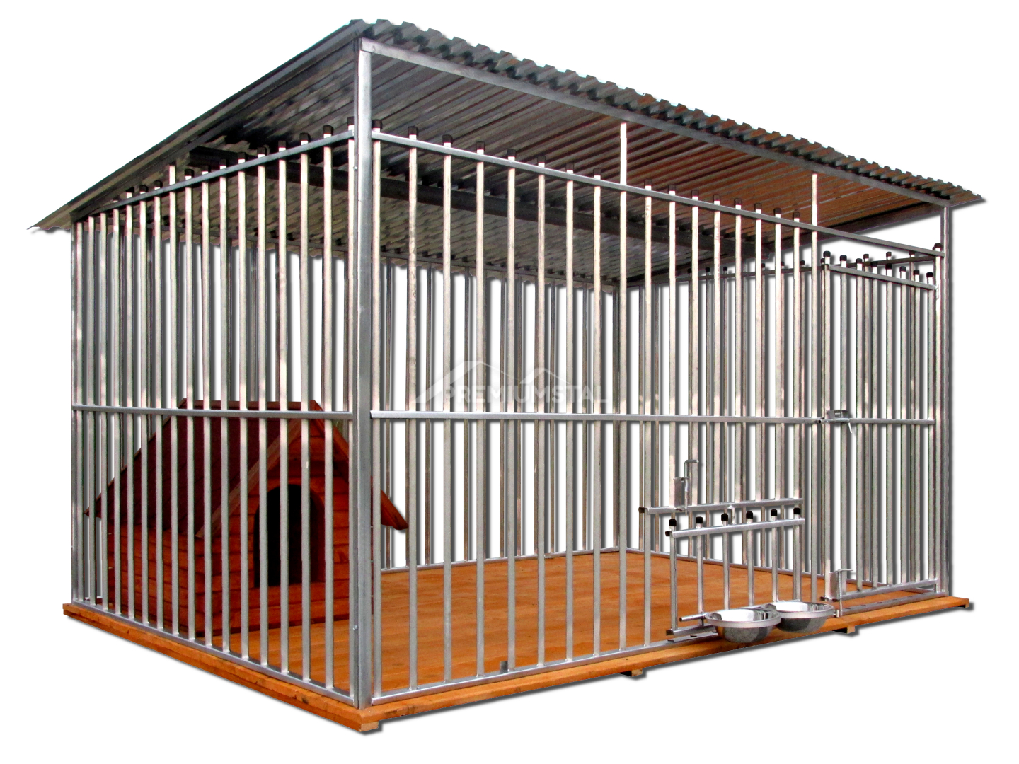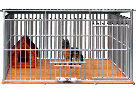 Oferowanym produktem jest kojec dla psa wykonany z profili ocynkowanych, zawijanych-niezgrzewanych, wzbogacony w drewnianą podłogę, obrotowe uchwyty na miski i czarne zaślepki na szczebelki.
