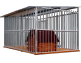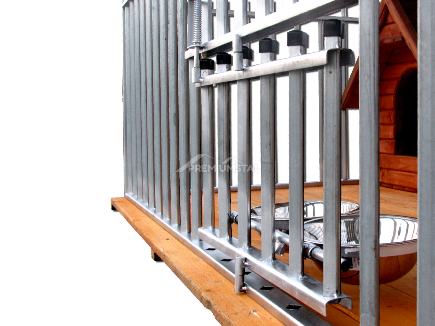KOJEC DLA PSA 3X3 – KOJEC Z PROFILI OCYNKOWANYCH Z DREWNIANĄ PODŁOGĄ, OBROTOWYMI UCHYWTMAI NA MISKI I CZARNYMI ZAŚLEPKAMI